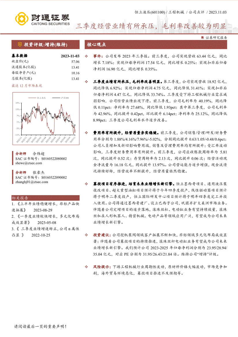恒立液压(601100) /工程机械/公司点评/ 2023.11.03 ! 三季度经营业绩有所承压,毛利率改善较为明显 证券研究报告投资评级:增持(维持) 核心观点基本数据2023-11-03 收盘价(元) 57.06 流通股本(亿股) 13.41 每股净资产(元) 10.16 总股本(亿股) 13.41 最近12月市场表现分析师佘炜超SAC证书编号:S02 分析师张豪杰SAC证书编号:S02 相关报告1. 《上半年业绩稳健增长,非标产品快速拓展》 2023-08-29 2. 《一季度业绩较快增长,多元化布局成效显著》 2023-05-08 3. 《三季度业绩增速转正,公司α属性凸显》 2022-10-25 事件:公司发布2023年三季报。